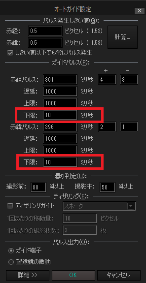 オートガイド設定 → ガイドパルス → 赤経/赤緯 → 下限