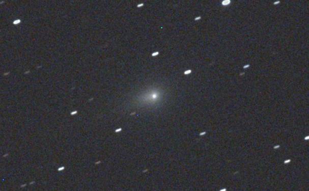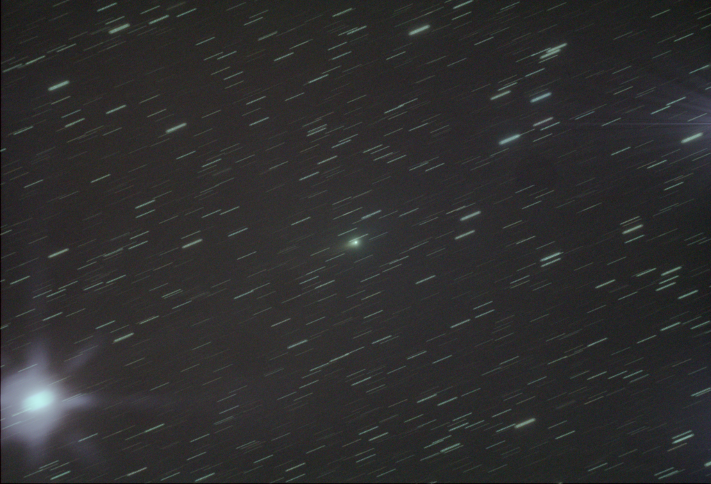 ガイド対象を彗星に設定しているため、彗星の核は点像として写り、背景の恒星は移動方向に沿って線状に写っています。