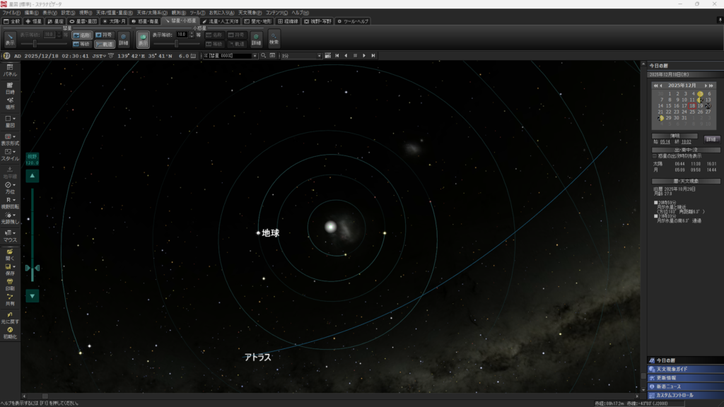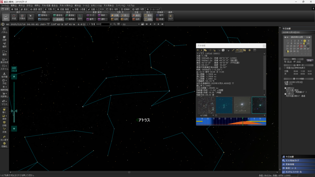 撮影日は2025年12月18日で、地球最接近の前日にあたります。撮影時、アトラス彗星はしし座付近を移動しており、火星軌道の外側を秒速約70kmで通過していました。移動速度が速いため、恒星基準での長時間露出には適さない条件でした。