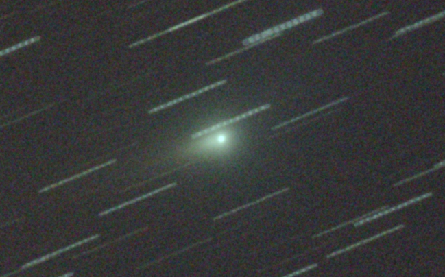 短時間露出で撮影すれば彗星は点状に写ります。その画像を彗星基準でコンポジットするのが「ステライメージ」のメトカーフコンポジットです。詳しくは以下をご覧ください。